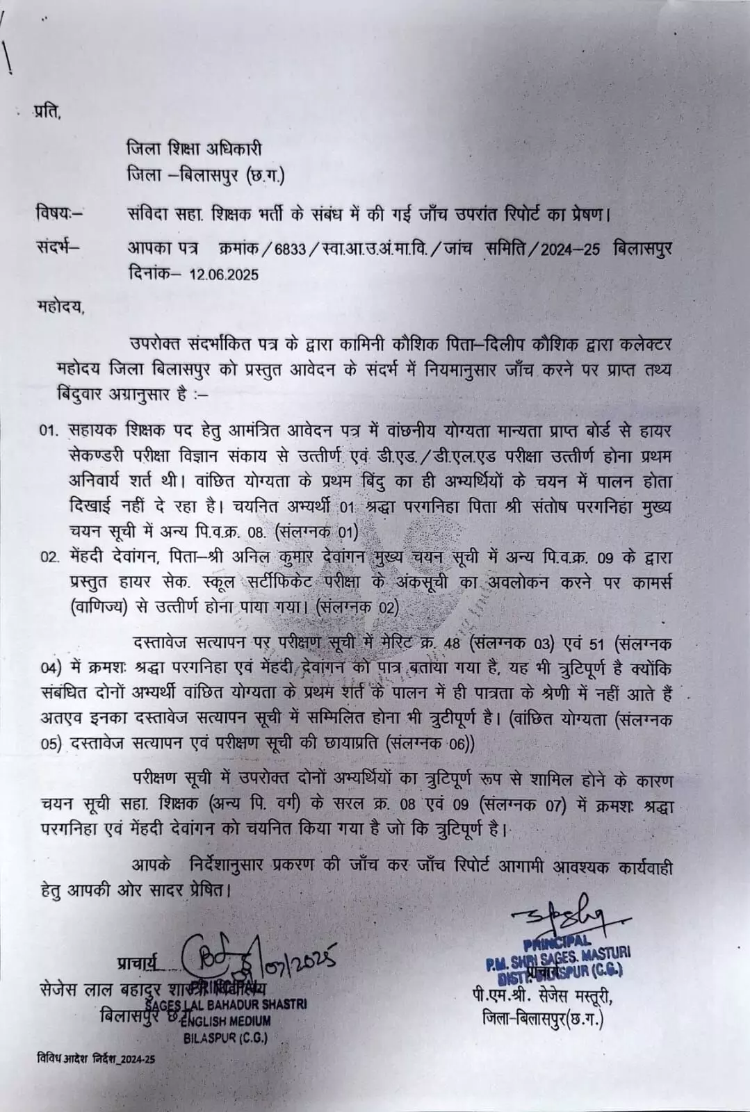 - सहायक शिक्षक पद हेतु आमंत्रित आवेदन पत्र में वांछनीय योग्यता मान्यता प्राप्त बोर्ड से हायर सेकण्डरी परीक्षा विज्ञान संकाय से उत्तीर्ण एवं डीएड, डीएलएड परीक्षा उत्तीर्ण होना प्रथम अनिवार्य शर्त थी। वांछित योग्यता के प्रथम बिंदु का ही अभ्यर्थियों के चयन में पालन होता दिखाई नहीं दे रहा है। चयनित अभ्यर्थी 01 श्रद्धा परगनिहा पिता संतोष परगनिहा मुख्य चयन सूची में अन्य पि.व.क्र. 08.