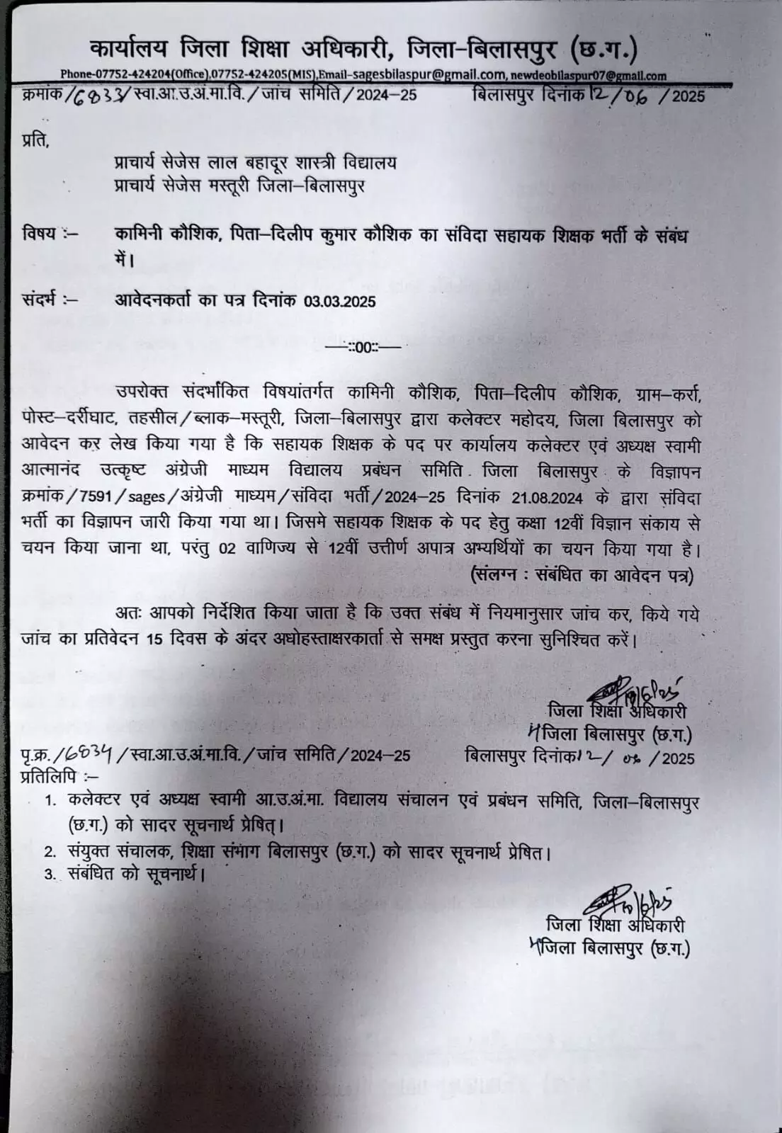 संविदा सहायक शिक्षक भर्ती में गड़बड़ी की शिकायत और जांच की मांग करते हुए कामिनी कौशिक पिता-दिलीप कौशिक ने कलेक्टर बिलासपुर संजय अग्रवाल को पत्र सौंपा था। मामले की गंभीरता को देखते हुए कलेक्टर ने डीईओ बिलासपुर विजय तांडे को शिकायत की जांच करने और रिपोर्ट पेश करने का निर्देश दिया था।