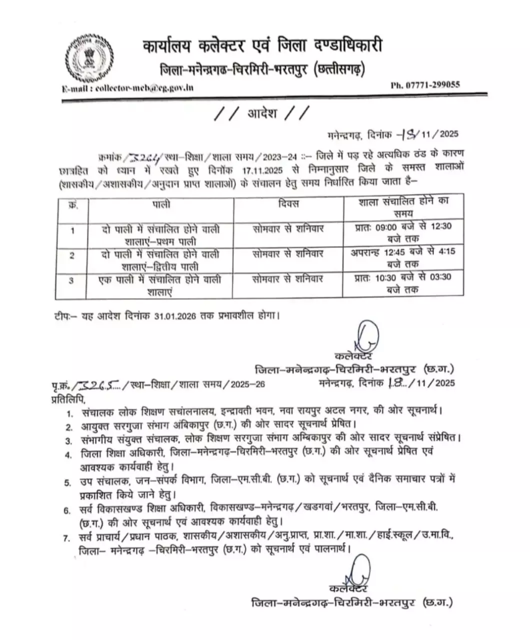 मनेंद्रगढ़, चिरमिरी, भरतपुर जिले में भी ठंड को देखते हुए शासकीय, प्राइवेट और अनुदान प्राप्त स्कूलों के समय में बदलावा किया गया है। यह नया समय आज 19 नवंबर से 31 जनवरी तक लागू होगा। कलेक्टर राहुल वेंकट को जारी निर्देश के अनुसार ठंड से बचाने यह आदेश जारी किया गया है।