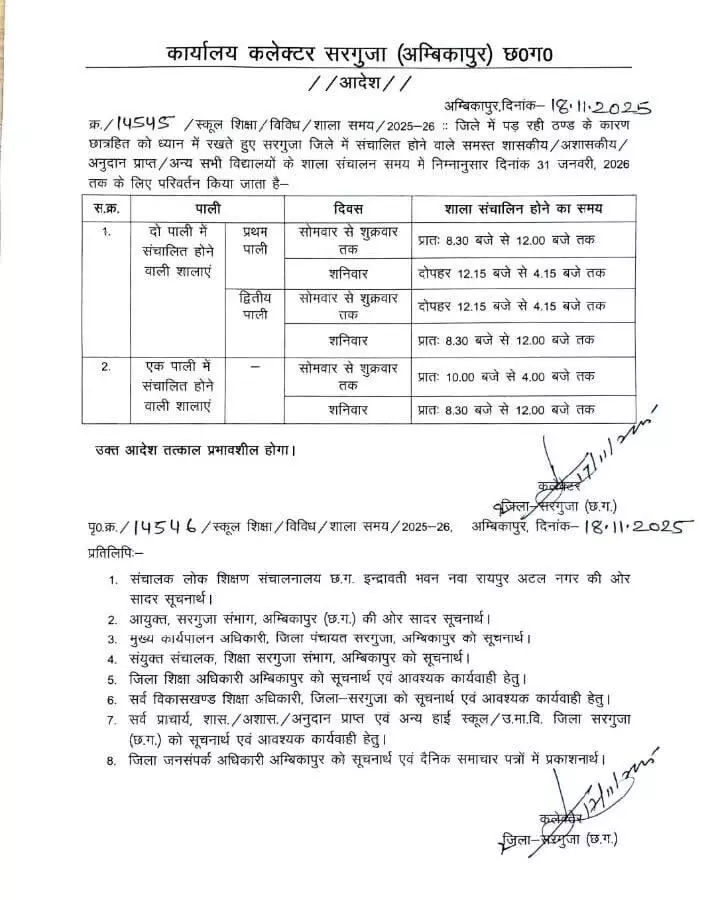 सरगुजा कलेक्टर विलास भोस्कर संदीपन ने जिले के समस्त शासकीय व निजी विद्यालयों के कक्षा संचालन के समय में परिवर्तन किया है।कड़ाके की ठंड से बच्चों को सुबह-सुबह स्कूल जाने में परेशानी हो रही थी। जिसको देखते हुए सरगुजा जिले में स्कूल की टाइम निम्नानुसार किया गया है