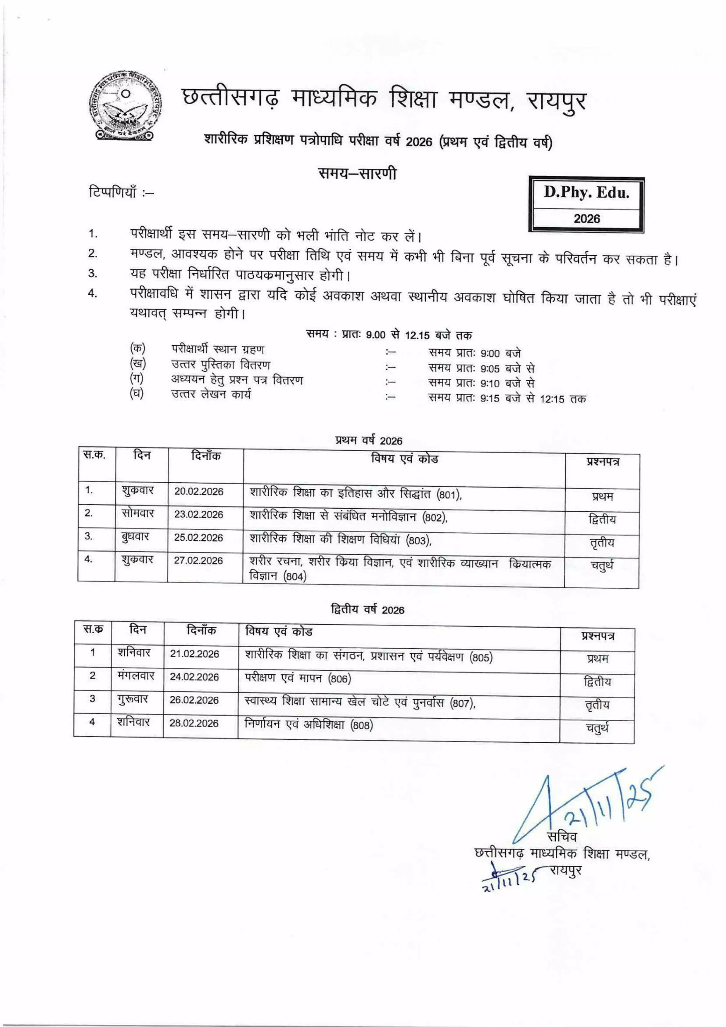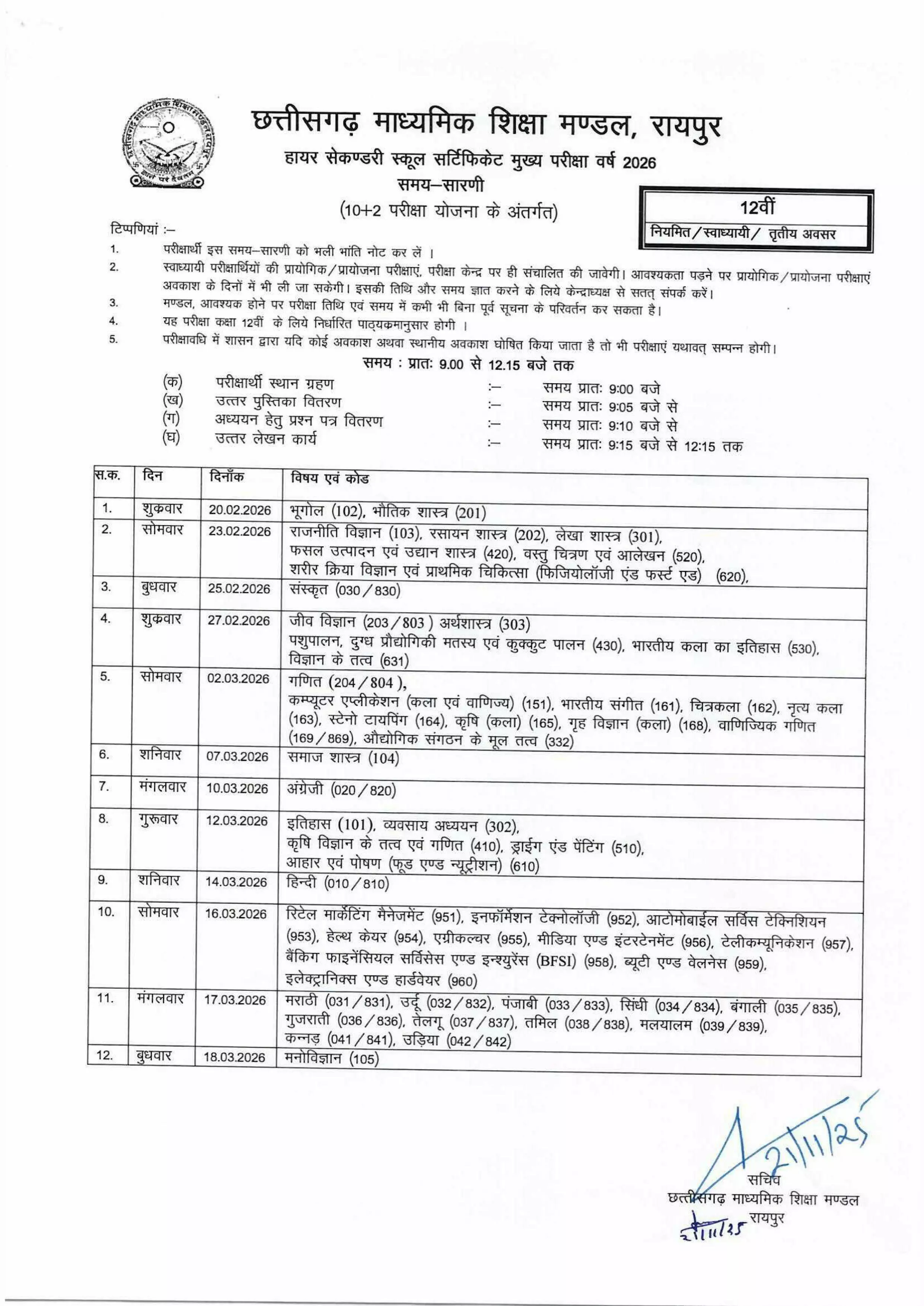 छत्तीसगढ़ ताज़ा खबर CG Board Exam 2026: 10वीं-12वीं बोर्ड परीक्षा की तारीख घोषित, इस बार फरवरी से शुरू होंगे एग्जाम… देखें जारी समय सारणी Sandhya 22/11/2025 रायपुर। छत्तीसगढ़ के बोर्ड परीक्षा की तैयारियों में जुटे परीक्षार्थियों के लिए बड़ी खबर है। माध्यमिक शिक्षा मण्डल ने 10वीं-12वीं परीक्षाआंे के लिए समय सारणी जारी कर दी है। इस बार बोर्ड परीक्षाएं फरवरी से शुरू होगी। नीचे देखें समय सारणी… Post navigation Previous: आपके लिए क्या लाया है (22.11.2025) का दिन, पढ़ें आज का राशिफल…Next: गोलीकांड के दो शूटर झारखंड से गिरफ्तार, भाड़े पर लाये गये थे, एक आरोपी कर रहा था प्रतियोगिता परीक्षा की तैयारी… More Stories छत्तीसगढ़ ताज़ा खबर जादू-टोना के शक में खूनी खेल, बुजुर्ग की चाकू से हत्या; दो आरोपियों को पुलिस ने किया गिरफ्तार Sandhya 10/03/2026 छत्तीसगढ़ ताज़ा खबर रेलवे ट्रैक के पास शराब की भट्ठी, नाले से मिला 6 टन महुआ, 300 डिब्बों में भरा जखीरा Sandhya 10/03/2026 छत्तीसगढ़ ताज़ा खबर 7 हिल्स बियर की कैन में दूसरे ब्रांड का लेबल, ग्राहकों को बेचा जा रहा था; निर्माता पर जुर्माना, सेल्समैन ब्लैकलिस्ट Sandhya 10/03/2026