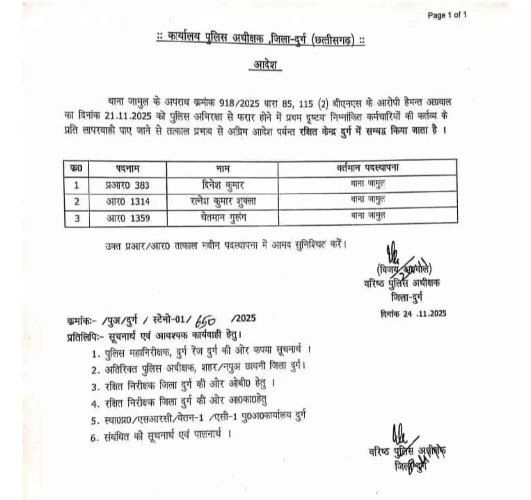 जामुल थाना के अपराध क्रमांक 918/2028 धारा 85,115(2) बीएनएस के आरोपी हेमन्त अग्रवाल के फरार होने के मामले में कार्यवाही की है। आरोपी के भागने पर कर्तव्य में लापरवाही बरतने पर प्रधान आरक्षक दिनेश कुमार और आरक्षक रत्नेश कुमार शुक्ला, चेतमान गुरुंग तीनों थाना जामुल को एसएसपी विजय अग्रवाल ने लाइन अटैच कर दिया है।