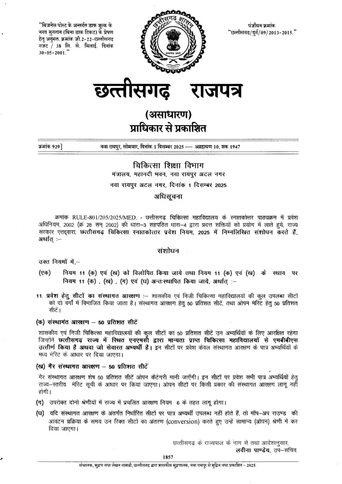 अधिसूचना क्रमांक RULE-801/205/2025/MED. छत्तीसगढ़ चिकित्सा महाविद्यालय के स्नातकोत्तर पाठ्यक्रम में प्रवेश अधिनियम, 2002 (क्र 28 सन् 2002) की धारा-3 सहपठित धारा 4 द्वारा प्रदत्त शक्तियों को प्रयोग में लाते हुये, राज्य सरकार एतद्वारा, छत्तीसगढ़ चिकित्सा स्नातकोत्तर प्रवेश नियम, 2025 में निम्नलिखित संशोधन करते हैं,