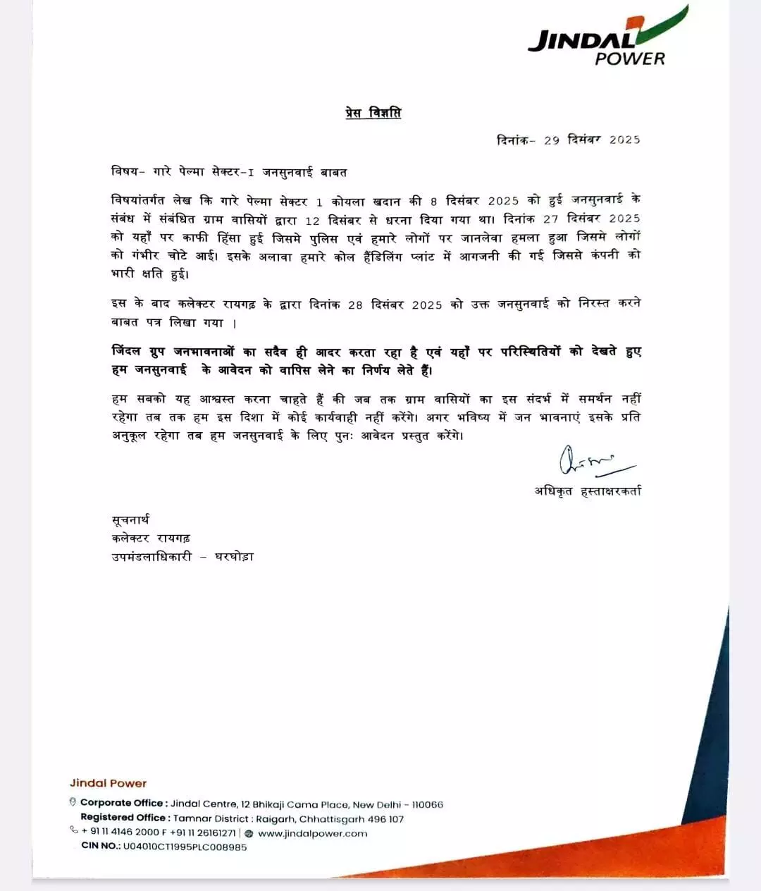 जिंदल पावर ने अपने पत्र में कहा है कि जनसुनवाई के विरोध में चल रहे धरने के दौरान हिंसक घटनाएं हुईं, जिसमें पुलिस और कंपनी कर्मचारियों पर हमला हुआ तथा कोल हैंडलिंग प्लांट में आगजनी से कंपनी को भारी नुकसान हुआ। कंपनी ने जनभावनाओं का सम्मान करते हुए स्पष्ट किया है कि ग्रामीणों की सहमति के बिना आगे कोई कार्रवाई नहीं की जाएगी और भविष्य में अनुकूल माहौल होने पर ही पुनः जनसुनवाई के लिए आवेदन किया जाएगा।