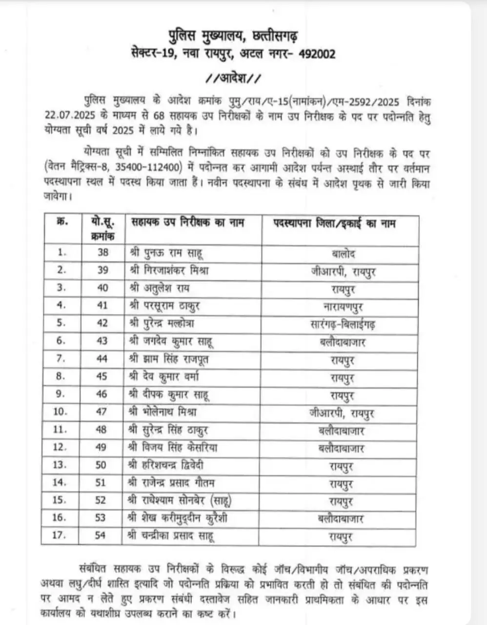 रायपुर। पुलिस मुख्यालय ने 17 एएसआई को एसआई के पद पर पदोन्नति दी है। 27 मई 2025 को 68 सहायक उप निरीक्षकों के नाम की फीट लिस्ट जारी की गई थी। जिसमें शामिल कुछ एएसआई का प्रमोशन पूर्व में किया जा चुका है। अब सूची में शामिल 17 एएसआई को एसआई के पद पर पदोन्नति दी गई है। पदोन्नत एएसआई को उसी इकाई में पदस्थ रखा गया है। बाद में उनकी नवीन पदस्थापना संबंधी पृथक से आदेश जारी की जाएगी।
