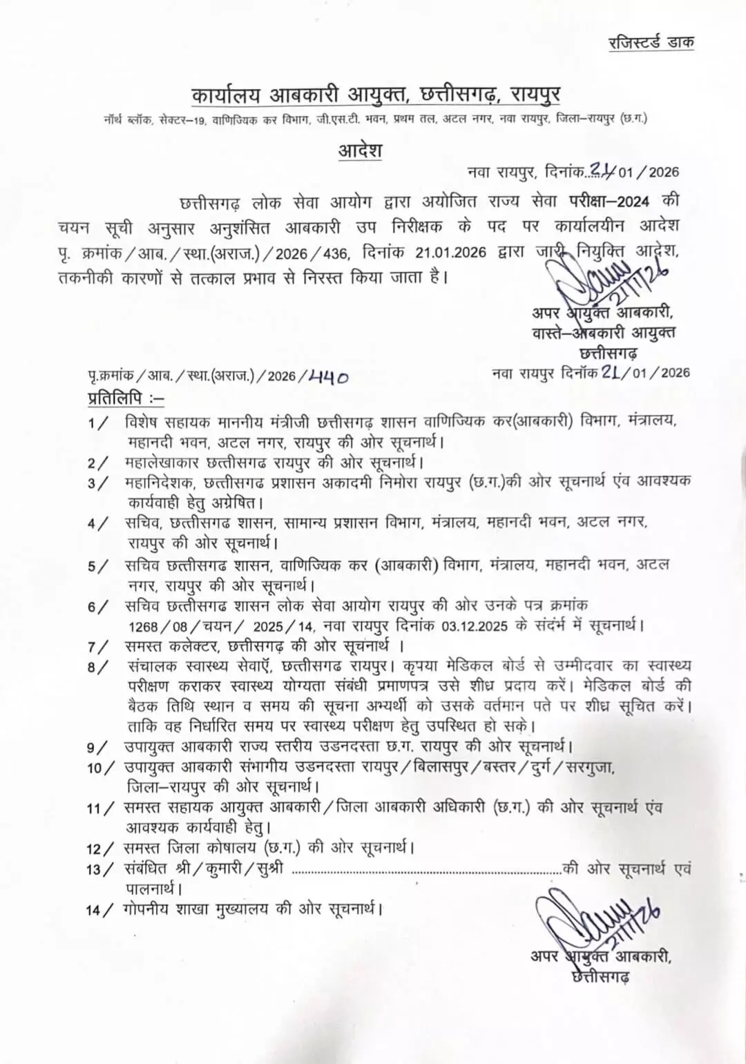 जारी आदेश में कहा गया है कि आदेश… छत्तीसगढ़ लोक सेवा आयोग द्वारा अयोजित राज्य सेवा परीक्षा-2024 की चयन सूची अनुसार अनुशंसित आबकारी उप निरीक्षक के पद पर कार्यालयीन आदेश पृ. क्रमांक / आब. / स्था. (अराज.) / 2026/436, दिनांक 21.01.2026 द्वारा जारी नियुक्ति तकनीकी कारणों से तत्काल प्रभाव से निरस्त किया जाता है।