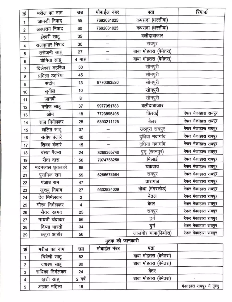 मृतकों में चार ( 01 पुरुष 02 महिला 01 बच्ची, एक अन्य रेफर मरीजों में से मेकाहारा रायपुर में एक और मृत्यु हो गई) की इलाज दौरान अस्पताल में मृत्यु हो गई है। सीएचसी सिमगा में 14 लोगों का इलाज जारी है। 3 लोगों को रायपुर रेफर किया गया है ।