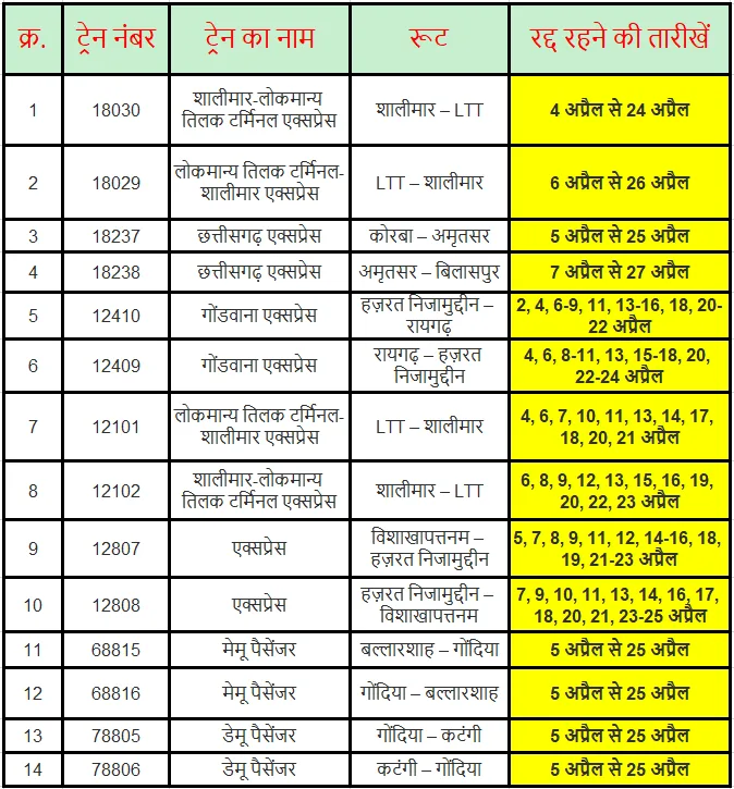 ट्रेन यात्रियों के लिए अलर्ट, छत्तीसगढ़ में 5 अप्रैल से 14 ट्रेनें रद्द, यात्रियों की बढ़ेंगी मुश्किलें