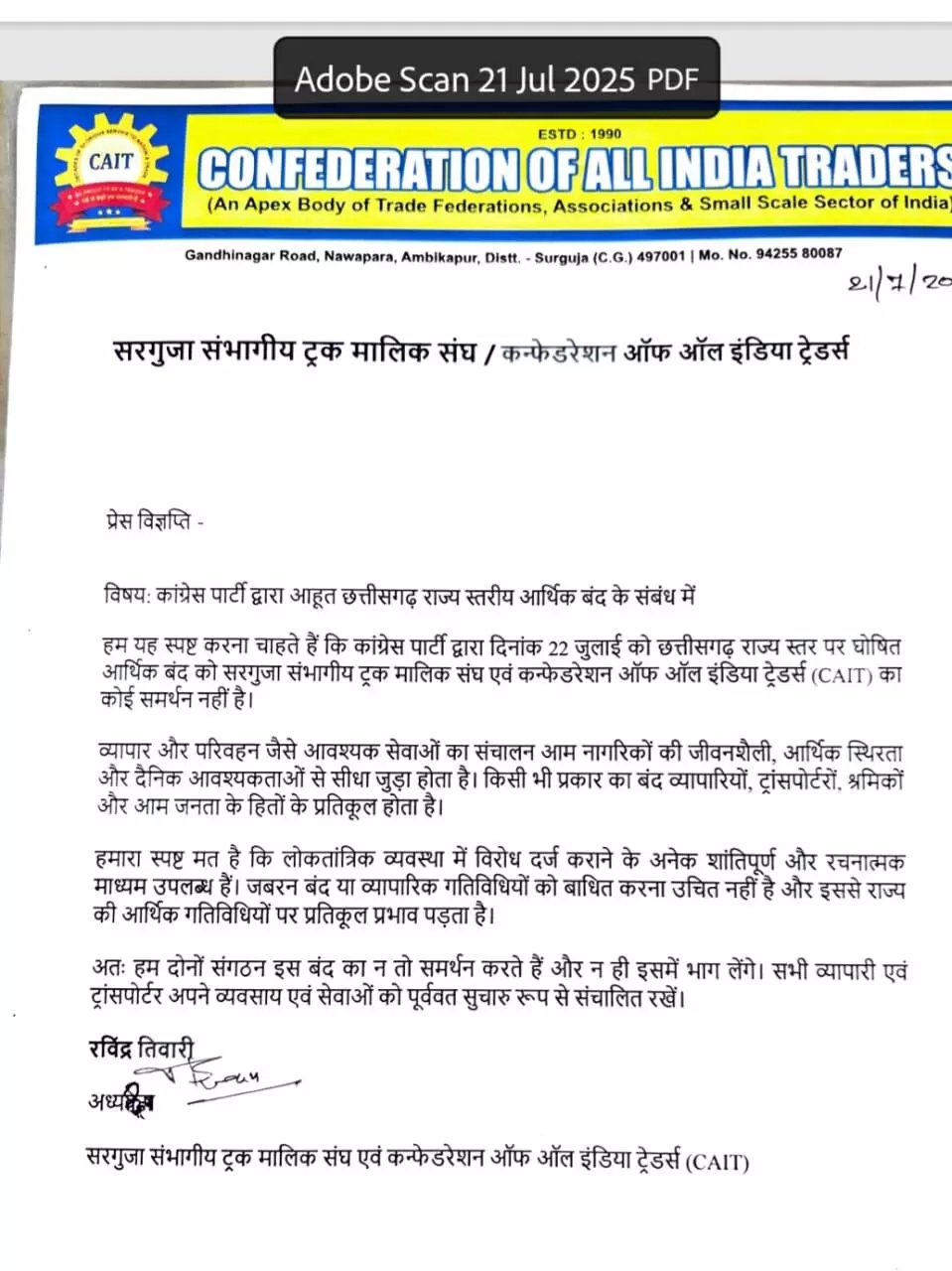रायपुर। सरगुजा संभागीय ट्रक मालिक संघ एवं कन्फेडरेशन आफ इंडिया ट्रेडर्स द्वारा कांग्रेस के 22 जुलाई को आहूत आर्थिक नाके बंदी को समर्थन देने से इंकार किया है। सरगुजा संभागीय ट्रक मालिक संघ के अध्यक्ष रविंद्र तिवारी ने कहा है की हम यह स्पष्ट करना चाहते हैं कि कांग्रेस पार्टी द्वारा 22 जुलाई को छत्तीसगढ़ राज्य स्तरीय घोषित आर्थिक बंद को सरगुजा संभागीय ट्रक मालिक संघ एवं कनफेडरेशन ऑफ आल इंडिया ट्रेडर्स का कोई समर्थन नहीं है।