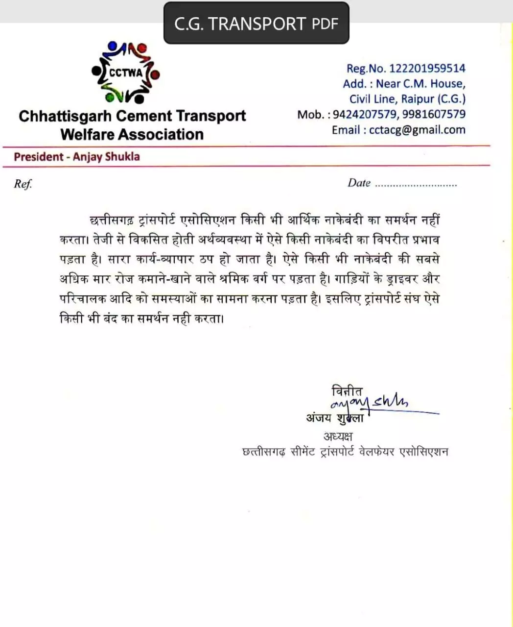 इसी तरह छत्तीसगढ़ सीमेंट ट्रांसपोर्ट वेलफेयर एसोसिएशन के अध्यक्ष अंजय शुक्ला ने भी कांग्रेस के आर्थिक नाकेबंदी के समर्थन से इंकार किया है। उन्होंने कहा की छत्तीसगढ़ ट्रांसपोर्ट एसोसिएशन किसी भी आर्थिक नाकेबंदी का समर्थन नहीं करता। तेजी से विकसित होती अर्थव्यवस्था में ऐसे किसी भी नाकेबंदी का विपरीत प्रभाव पड़ता है। सारा कार्य व्यापार ठप्प हो जाता है। ऐसे किसी भी नाकेबंदी की सबसे अधिक मार रोज कमाने खाने वाले श्रमिक वर्गों पर पड़ता है। गाड़ियों के ड्राइवर और परिचालक आदि को अनेक समस्याओं का सामना करना पड़ता है। इसलिए ट्रांसपोर्टर संघ ऐसे किसी भी बंद का समर्थन नहीं करता।