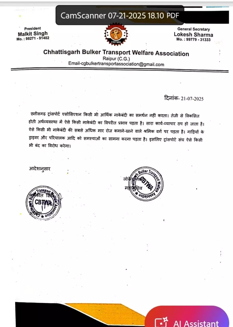 आर्थिक नाकेबंदी का ट्रक एसोसिएशन का समर्थन नहीं, छत्तीसगढ़ सीमेंट ट्रांसपोर्ट एसोसिएशन ने भी किया इंकार