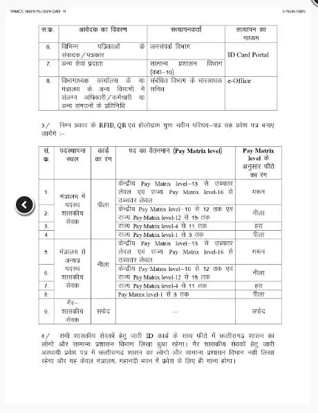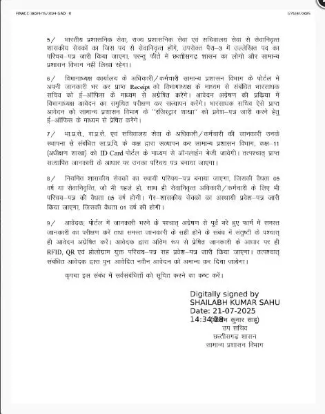आदेश में लिखा है…छत्तीसगढ़ शासन में कार्यरत भारतीय प्रशासनिक सेवा के अधिकारी, राज्य प्रशासनिक सेवा के अधिकारी, मंत्रालय में पदस्थ अन्य सेवाओं के अधिकारी, सचिवालय सेवा के अधिकारी / कर्मचारियों एवं विभाग से संलग्न कर्मचारियों के परिचय-पत्र सह प्रवेश पत्र की एकीकृत व्यवस्था की गई है, जिसके तहत समस्त अधिकारियों/ कर्मचारियों का RFID, QR एवं होलोग्राम युक्त परिचय पत्र बनाया जाएगा। समस्त अधिकारियों/ कर्मचारियों को मंत्रालय में प्रवेश करते समय एवं कार्यालयीन समय में नाम प्रदर्शित करते हुये परिचय-पत्र पहनना अनिवार्य होगा।