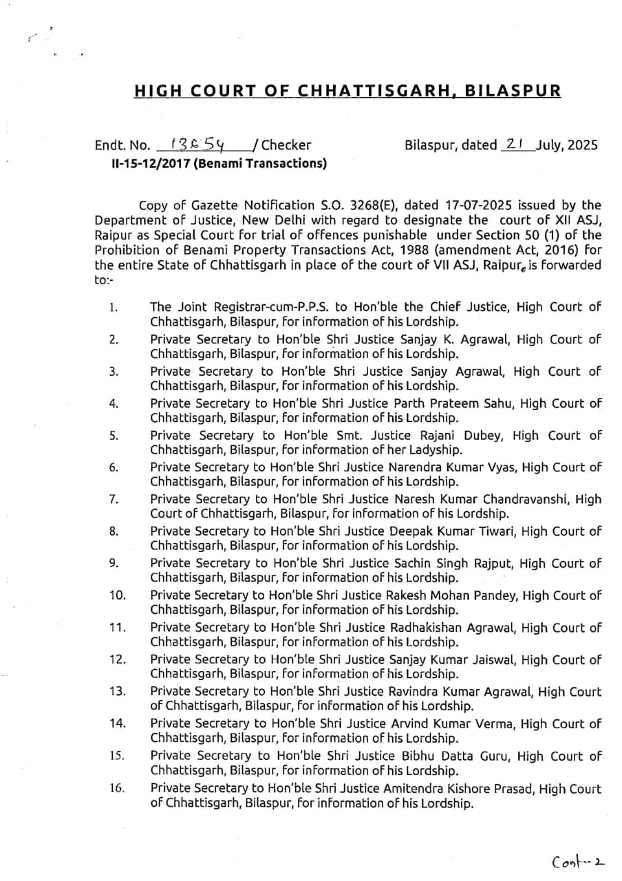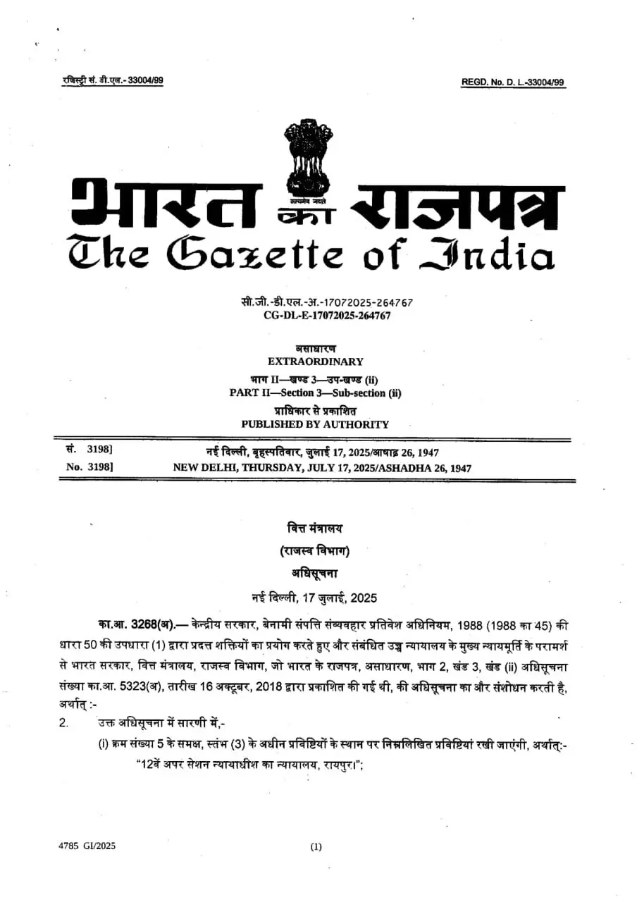 न्याय विभाग, नई दिल्ली द्वारा जारी राजपत्र अधिसूचना एस.ओ. 3268(ई), दिनांक 17 जुलाई 2025 की प्रति, जिसमें बेनामी संपत्ति लेनदेन प्रतिषेध अधिनियम, 1988 (संशोधन अधिनियम, 2016) की धारा 50 (1) के तहत दंडनीय अपराधों के परीक्षण के लिए VII ASJ, रायपुर के न्यायालय के स्थान पर पूरे छत्तीसगढ़ राज्य के लिए XII ASJ, रायपुर के न्यायालय को विशेष न्यायालय के रूप में नामित किया गया है, को अग्रेषित किया जाता है।