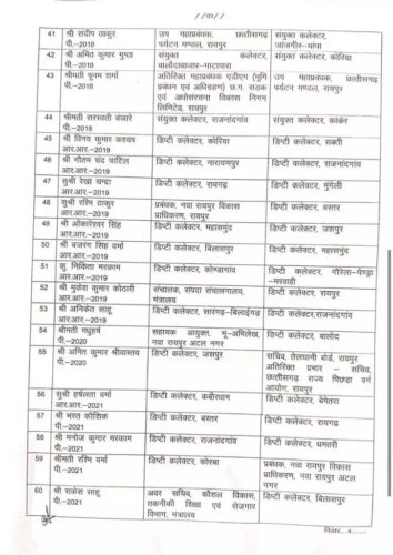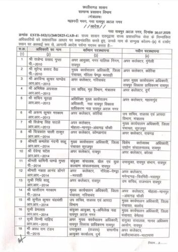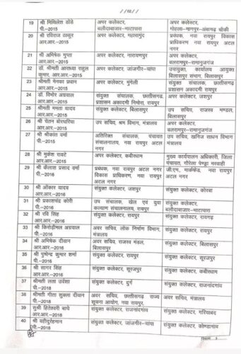 रायपुर। राज्य सरकार ने राज्य प्रशासनिक सेवा के 75 अधिकारियों को इधर से उधर किया है। सूची में अपर आयुक्त, मुख्य कार्यपालन अधिकारी, अपर कलेक्टर, उप सचिव, अतिरिक्त मुख्य कार्यपालन अधिकारी, के नाम शामिल है। सूची में शामिल सभी अधिकारियों को 10 दिनों के भीतर नई पदस्थापना पर कार्यभार ग्रहण करने का निर्देश भी दिया गया है। आदेश में ज्योति बबली कुजूर को उपायुक्त आदिम जाति तथा अनुसूचित जाति विकास को सचिव छत्तीसगढ़ पिछड़ा वर्ग आयोग के अतिरिक्त प्रभार से मुक्त किया गया है।