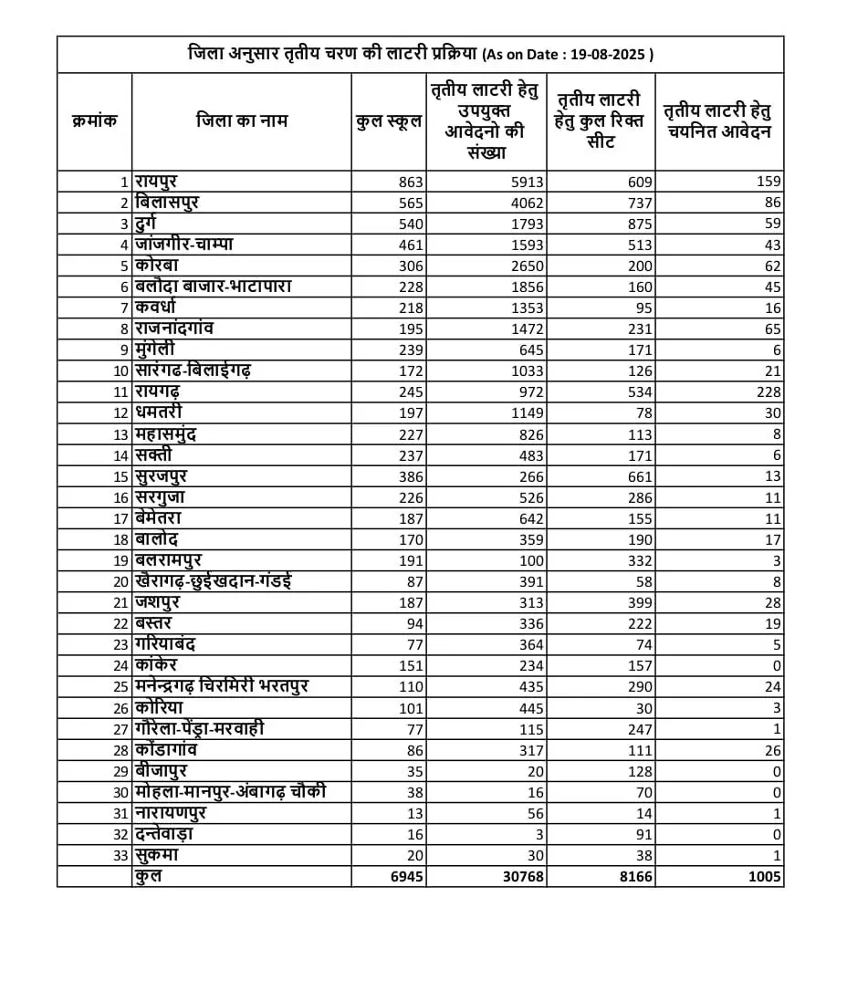 सभी 33 जिलों के 6945 स्कूलों की कुल 8166 सीटों के लिए लॉटरी प्रक्रिया आज किया गया 33 जिलों में कुल आवेदन 30768 प्राप्त हुए थे।