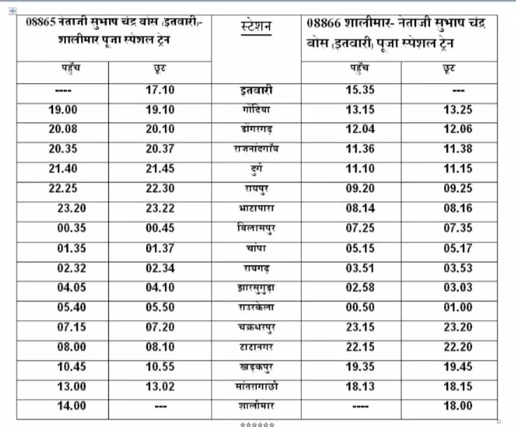 बिलासपुर। रेलवे प्रशासन द्वारा दुर्गा पूजा के दौरान यात्रियो की बेहतर यात्रा सुविधा हेतु नेताजी सुभाष चंद्र बोस (इतवारी) एवं शालीमार के मध्य दुर्गा पूजा स्पेशल गाड़ी का परिचालन 05 फेरों के लिए किया जा रहा है । गाड़ी संख्या 08865 नेताजी सुभाष चंद्र बोस (इतवारी)-शालीमार पूजा स्पेशल ट्रेन नेताजी सुभाष चंद्र बोस (इतवारी) से 27 सितम्बर से 01 अक्टूबर, 2025 तक तथा गाड़ी संख्या 08866 शालीमार- नेताजी सुभाष चंद्र बोस (इतवारी) पूजा स्पेशल ट्रेन शालीमार से 28 सितम्बर से 02 अक्टूबर, 2025 तक चलेगी। इस पूजा स्पेशल गाड़ी में 02 एसएलआरडी, 05 सामान्य, 08 स्लीपर, 02एसी-3, 01 एसी-2 सहित कुल 18 कोचों की सुविधा रहेगी।