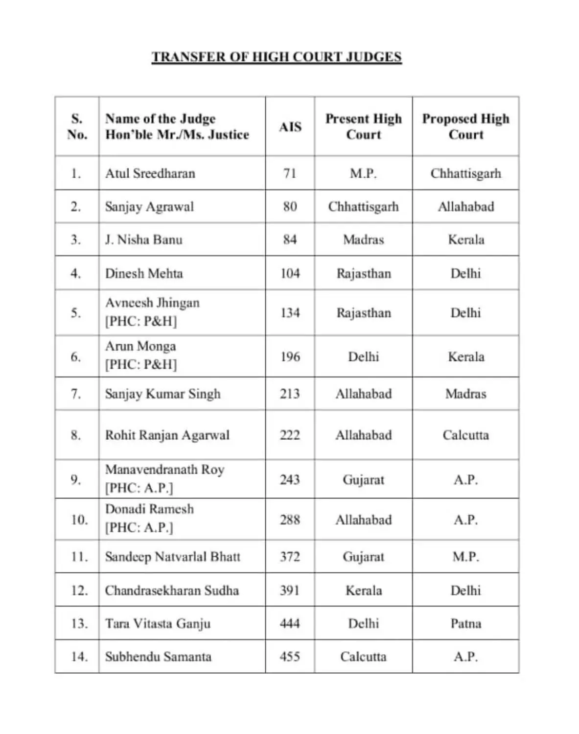 हाई कोर्ट जजों के स्थानांतरण के लिए सुप्रीम कोर्ट कॉलेजियम द्वारा प्रस्ताव विधि मंत्रालय को भेजा जाता है। राष्ट्रपति के हस्ताक्षर होने के बाद यह आदेश जारी किया जाता है। बिलासपुर हाई कोर्ट में पदस्थ जस्टिस संजय एस अग्रवाल बार कोटे से जस्टिस बने हैं। जस्टिस बनने के बाद वह बिलासपुर हाई कोर्ट में ही पदस्थ थे। उन्हें इलाहाबाद हाई कोर्ट भेजा गया है। मध्यप्रदेश हाई कोर्ट में चीफ जस्टिस के बाद अतुल श्रीधरन सबसे सीनियर जस्टिस हैं। उन्हें छत्तीसगढ़ हाई कोर्ट भेजा गया है।