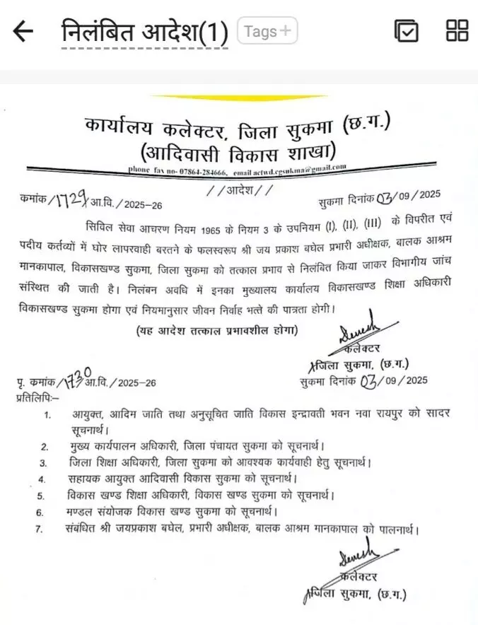 मामला जैसे ही जिला प्रशासन के संज्ञान में आया, कलेक्टर देवेश कुमार ध्रुव ने तत्काल जांच के आदेश दिए. सहायक आयुक्त हेमंत सिन्हा और मण्डल संयोजक मौके पर पहुंचे. जांच में यह स्पष्ट हुआ कि प्रभारी अधीक्षक जय प्रकाश बघेल ने अपने कर्तव्यों में गंभीर लापरवाही की है. जिसके बाद 3 सितंबर को आश्रम अधीक्षक को निलंबित कर दिया गया.