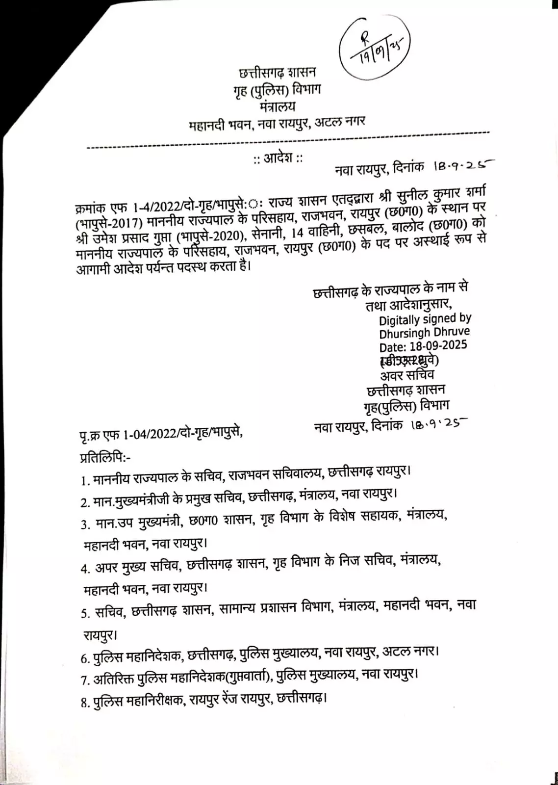 छत्तीसगढ़ ताज़ा खबर राज्यपाल के ADC बदले गए, 2020 बैच के IPS उमेश गुप्ता होंगे नए ADC, देखिए आदेश Sandhya 29/09/2025 रायपुर। छत्तीसगढ़ में राज्यपाल के परिसहाय को बदल दिया गया है। 2020 बैच के आईपीएस उमेश गुप्ता को आईपीएस सुनील कुमार शर्मा के स्थान पर राज्यपाल का एडीसी बनाया गया हैं। Post navigation Previous: कल होगी कैबिनेट की बैठक, कई महत्वपूर्ण मुद्दों पर लगेगी मुहर…Next: मां दुर्गा पर आपत्तिजनक टिप्पणी, व्हाट्सअप ग्रुप पर किया पोस्ट… More Stories ताज़ा खबर व्यापार Gold-Silver Price Today 7 March : आज सोना सस्ता हुआ या महंगा? जानिए आज के सोने-चांदी का ताजा भाव Sandhya 07/03/2026 छत्तीसगढ़ ताज़ा खबर होली का जश्न: चार दिनों में रायपुर के शराब प्रेमियों ने गटक दी 58 करोड़ 10 लाख की शराब Sandhya 06/03/2026 छत्तीसगढ़ ताज़ा खबर DSP डायमंड सिंह की ऊँची उड़ान: UPSC में 623वां रैंक, IPS का सफर तय, IAS की राह भी खुली Sandhya 06/03/2026