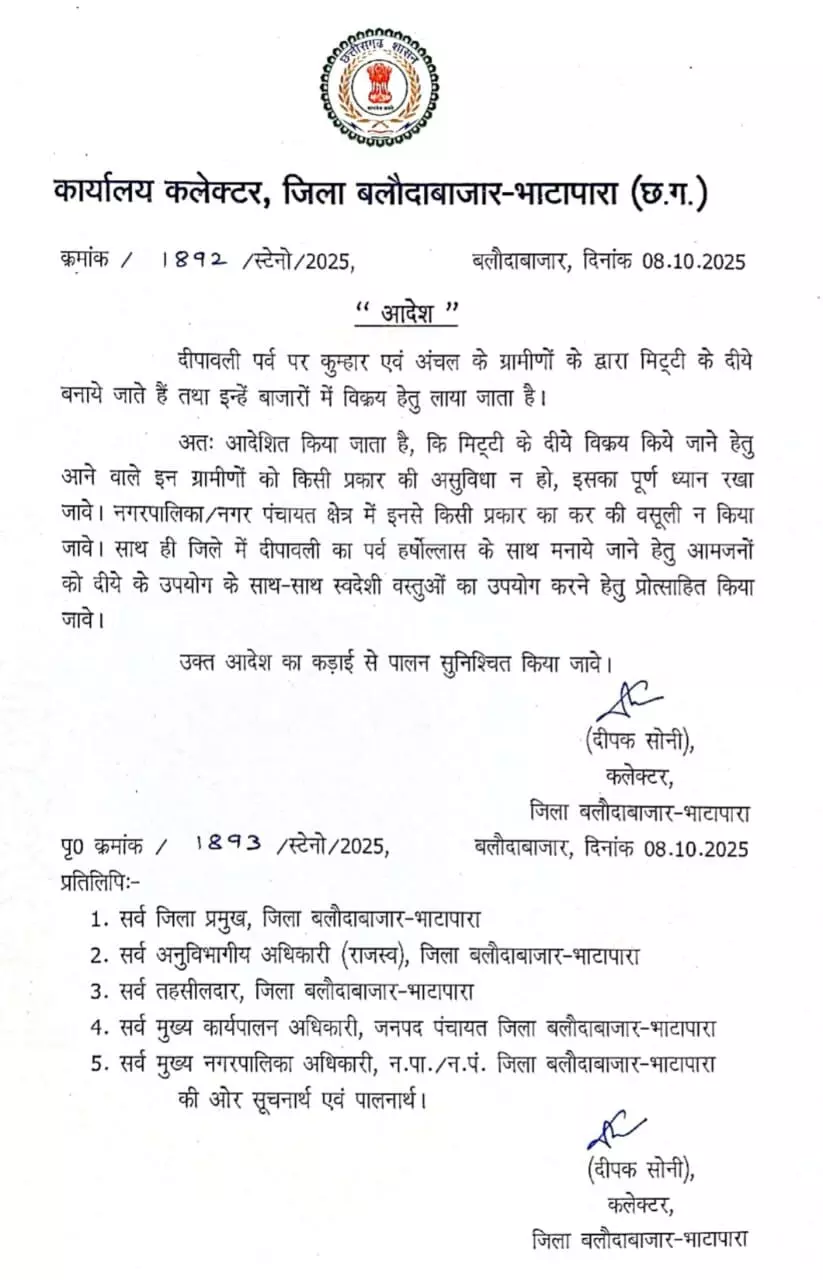 कलेक्टर ने आज इस बाबत आदेश भी जारी किया है, नीचे पढ़ें आदेश में क्या कुछ लिखा हैं… ”दीपावली पर्व पर कुम्हार एवं अंचल के ग्रामीणों के द्वारा मिट्टी के दीये बनाये जाते हैं तथा इन्हें बाजारों में विक्रय हेतु लाया जाता है।