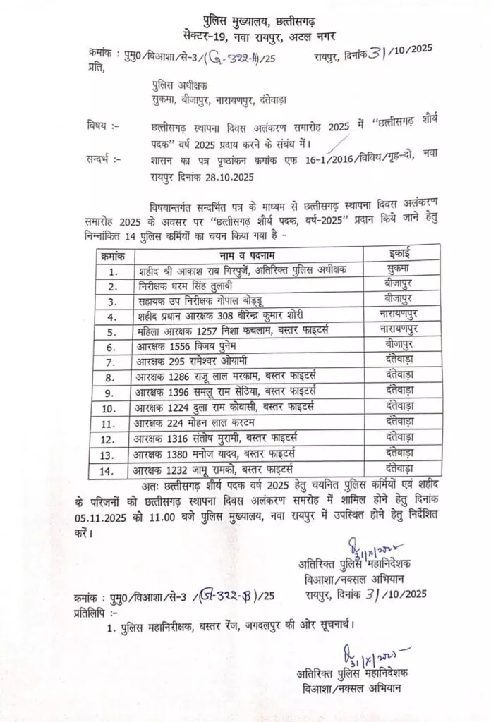 रायपुर। छत्तीसगढ़ पुलिस मुख्यालय ने शौर्य पदक सम्मान की घोषणा कर दी है। छत्तीसगढ़ राज्य स्थापना दिवस के मौके पर शहीद एएसपी सुकमा आकाश राव गिरपुंजे समेत 14 जांबाज पुलिसकर्मियों को यह सम्मान दिया जाएगा। अलंकरण समारोह 5 नवंबर को आयोजित किया जाएगा। अलंकरण समारोह में शहीद एएसपी के परिजन शामिल होंगे।