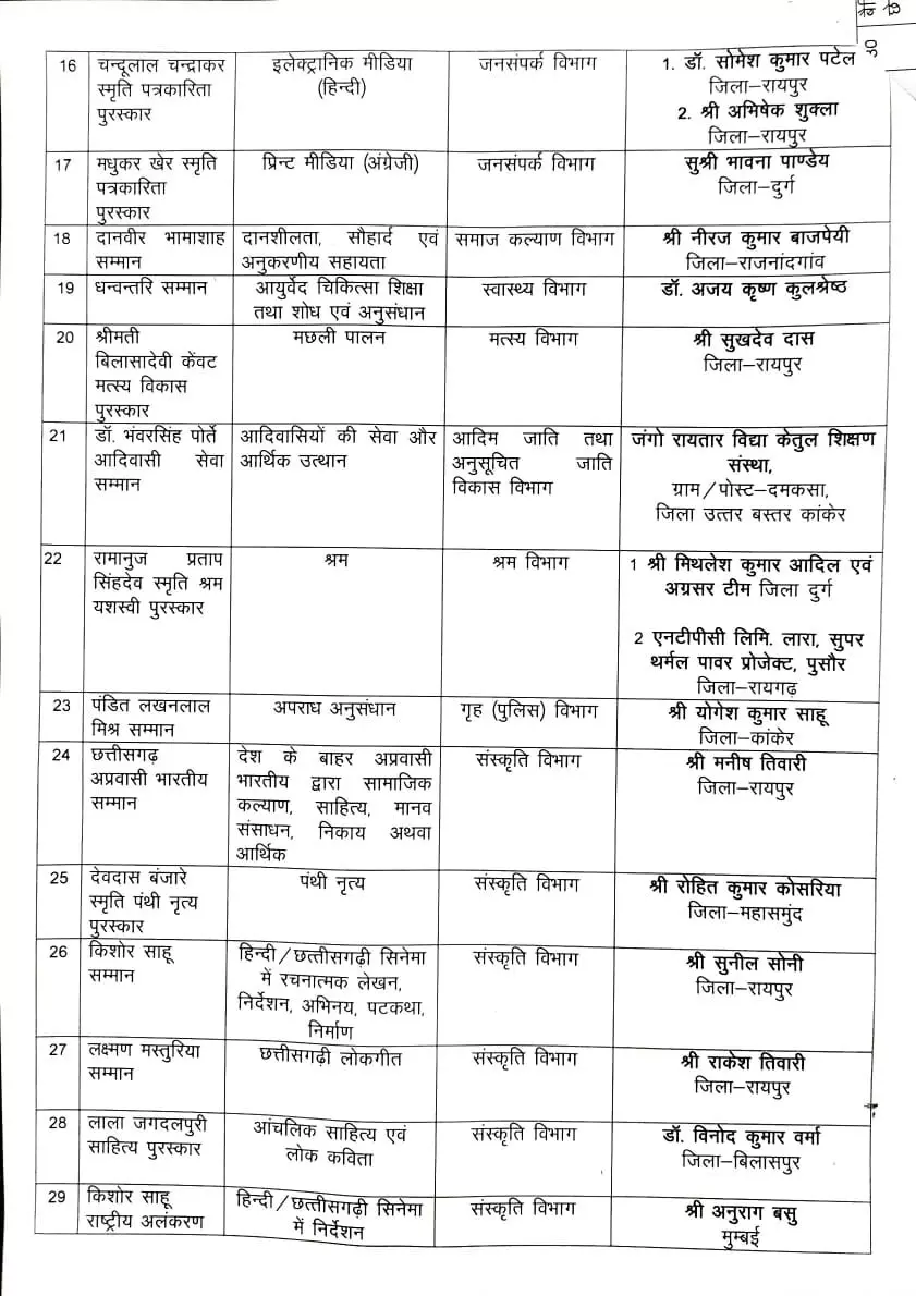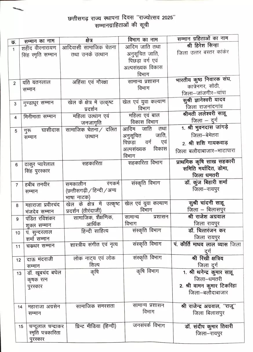 छत्तीसगढ़ ताज़ा खबर राज्य अलंकरण सम्मान की घोषणा… जानिए, पत्रकारिता, खेल, नाट्य, संगीत के क्षेत्र में कौन-कौन होंगे सम्मानित… Sandhya 05/11/2025 रायपुर। छत्तीसगढ़ में राज्य अलंकरण सम्मान की घोषणा कर दी गई है। राज्योत्सव कार्याक्रम के समापन में देश के उप राष्ट्रपति सीपी राधाकृष्णन सम्मानित करेंगे। नीचे देखें सूची… Post navigation Previous: कलयुग की यह कैसी मां, अपने ही प्रेमी से करवाया बेटी का रेप, फिर कोर्ट ने सुनाई 180 साल की सजाNext: आबकारी विभाग के SI ने ठेला लगाने वाले व्यापारी से की मारपीट, कॉलर पकड़ कर घसीटा- सड़क पर पटका, Video वायरल More Stories छत्तीसगढ़ ताज़ा खबर धमतरी में सेक्स रैकेट का पर्दाफाश: कॉलोनी वालों ने खुद किया छापा, आपत्तिजनक सामान के साथ 3 युवक और 2 युवतियां गिरफ्तार Sandhya 07/03/2026 छत्तीसगढ़ ताज़ा खबर ठगों ने पुलिस का भेष पहनकर बुजुर्ग से छीनी चेन, पुलिस ने कुछ घंटों में किया गिरफ्तार… Sandhya 07/03/2026 छत्तीसगढ़ ताज़ा खबर आपत्तिजनक स्थिति में पुलिस ने शिक्षक को किया गिरफ्तार, अकेली महिला के घर घुसा तो पति ने दरवाजा बंद किया… Sandhya 07/03/2026