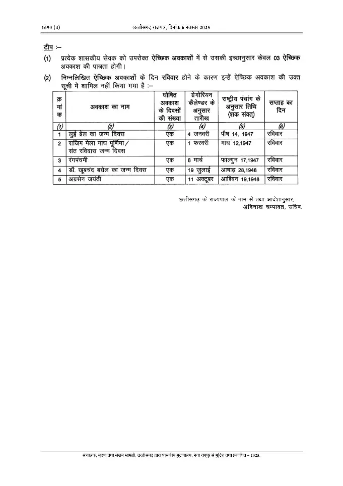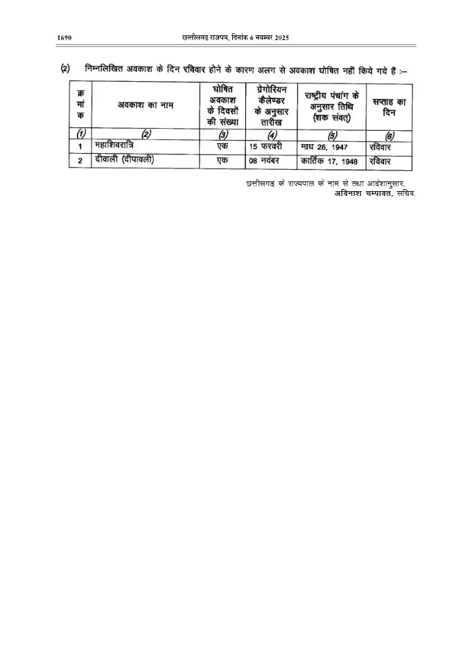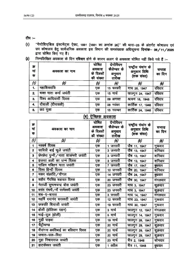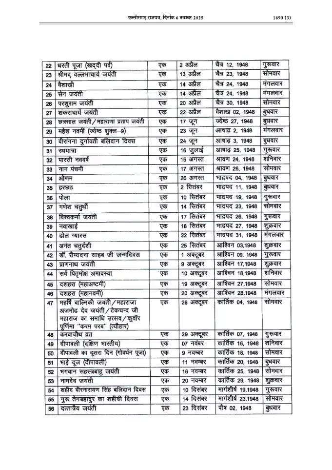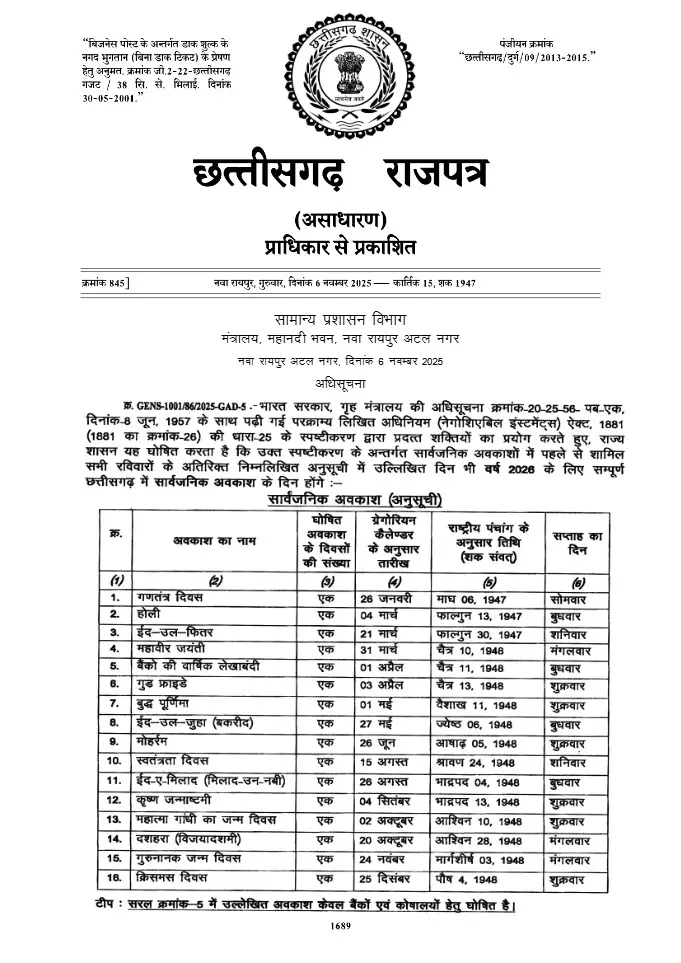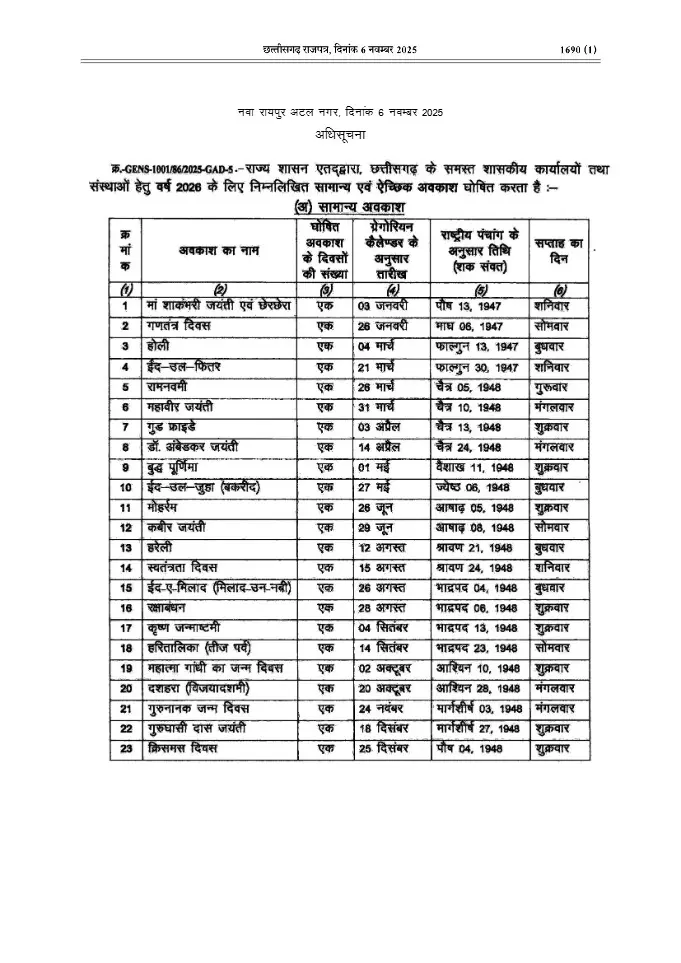 2026 की छुट्टियों का कैलेंडर जारी- Chhattisgarh Holiday List 2026