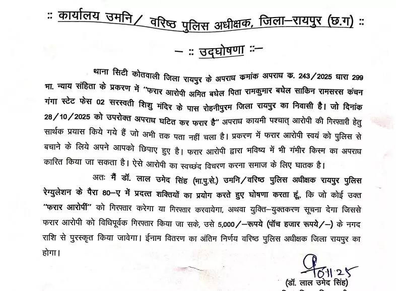 थाना सिटी कोतवाली जिला रायपुर के अपराध कमांक अपराध क. 243/2025 धारा 299 भा. न्याय संहिता के प्रकरण में “फरार आरोपी अमित बघेल पिता रामकुमार बघेल साकिन रामसरस कंचन गंगा स्टेट फेस 02 सरस्वती शिशु मंदिर के पास रोहनीपुरम जिला रायपुर का निवासी है। जो दिनांक 28/10/2025 को उपरोक्त अपराध घटित कर फरार है” अपराध कायमी पश्चात् आरोपी की गिरफ्तारी हेतु सार्थक प्रयास किये गये हैं जो अभी तक पता नहीं चला है। प्रकरण में फरार आरोपी स्वयं को पुलिस से बचाने के लिये अपने आपको छिपाए हुए है। फरार आरोपी द्वारा भविष्य में भी गंभीर किस्म का अपराध कारित किया जा सकता है। ऐसे आरोपी का स्वच्छंद विचरण करना समाज के लिए घातक है।